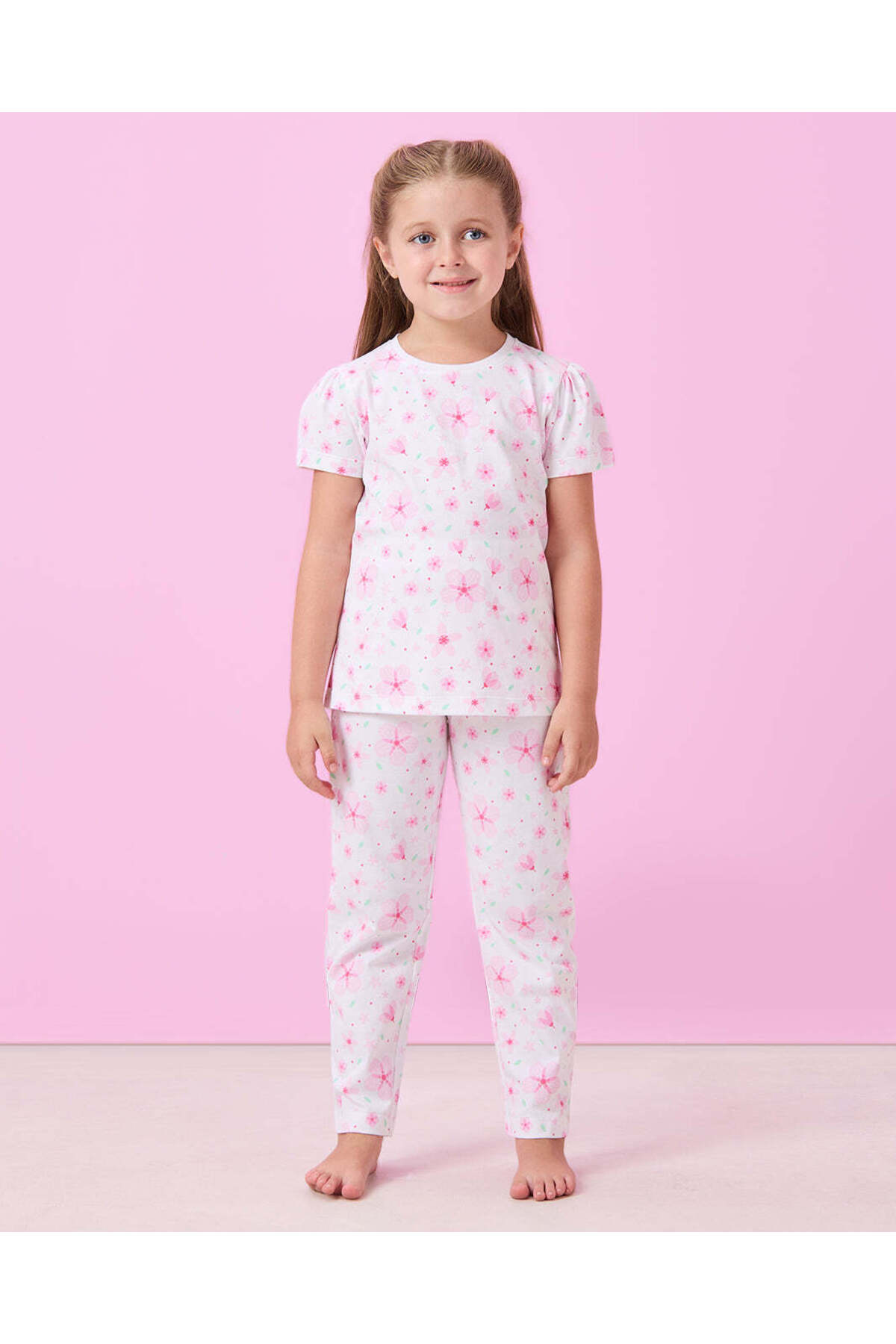 طقم بيجامة بناتي بطبعة زهور بيضاء (قطعتين)