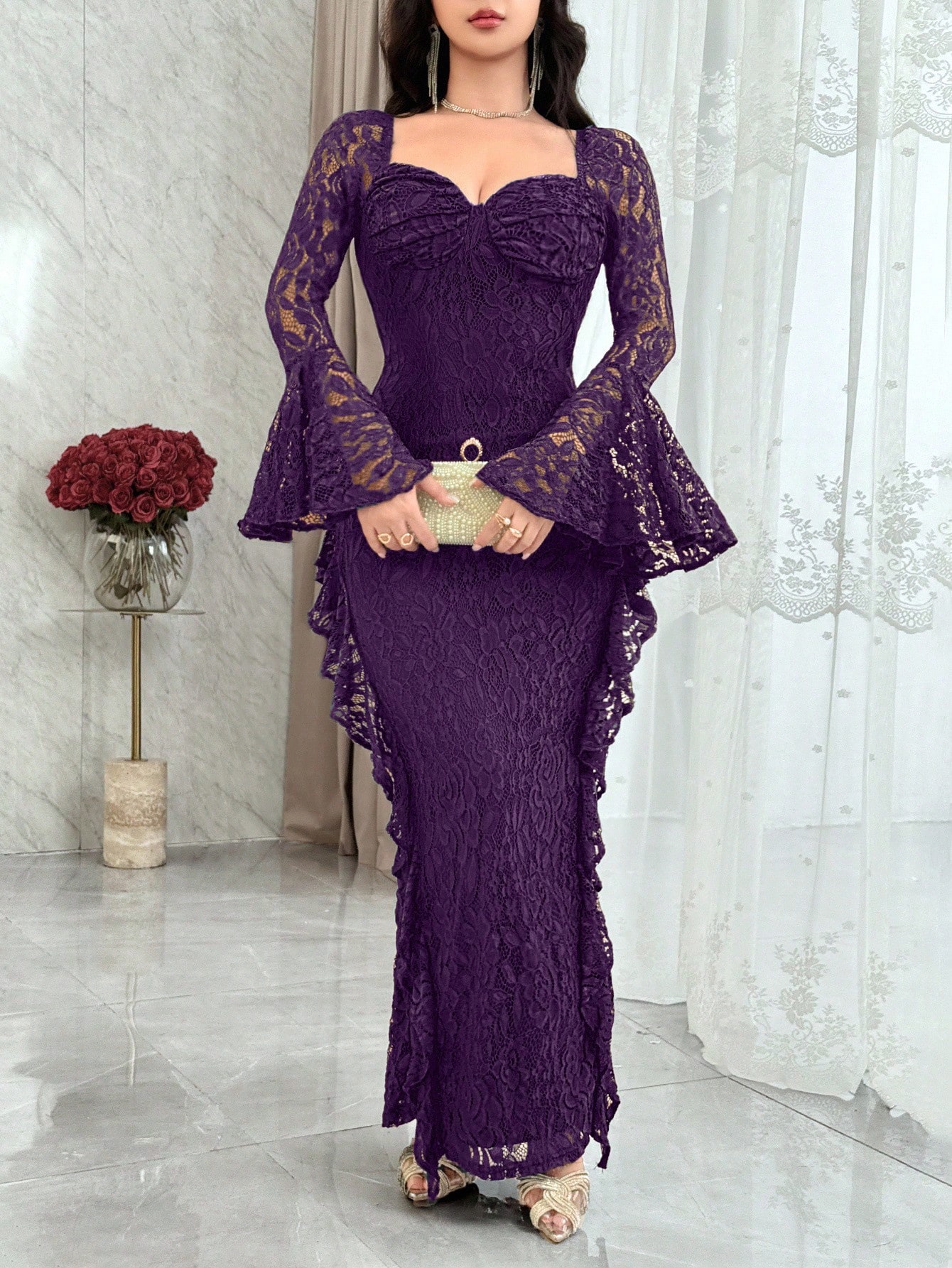 فستان نسائي أنيق بياقة قلب وأكمام مكشكشة مزخرف بالزهور والدانتيل
