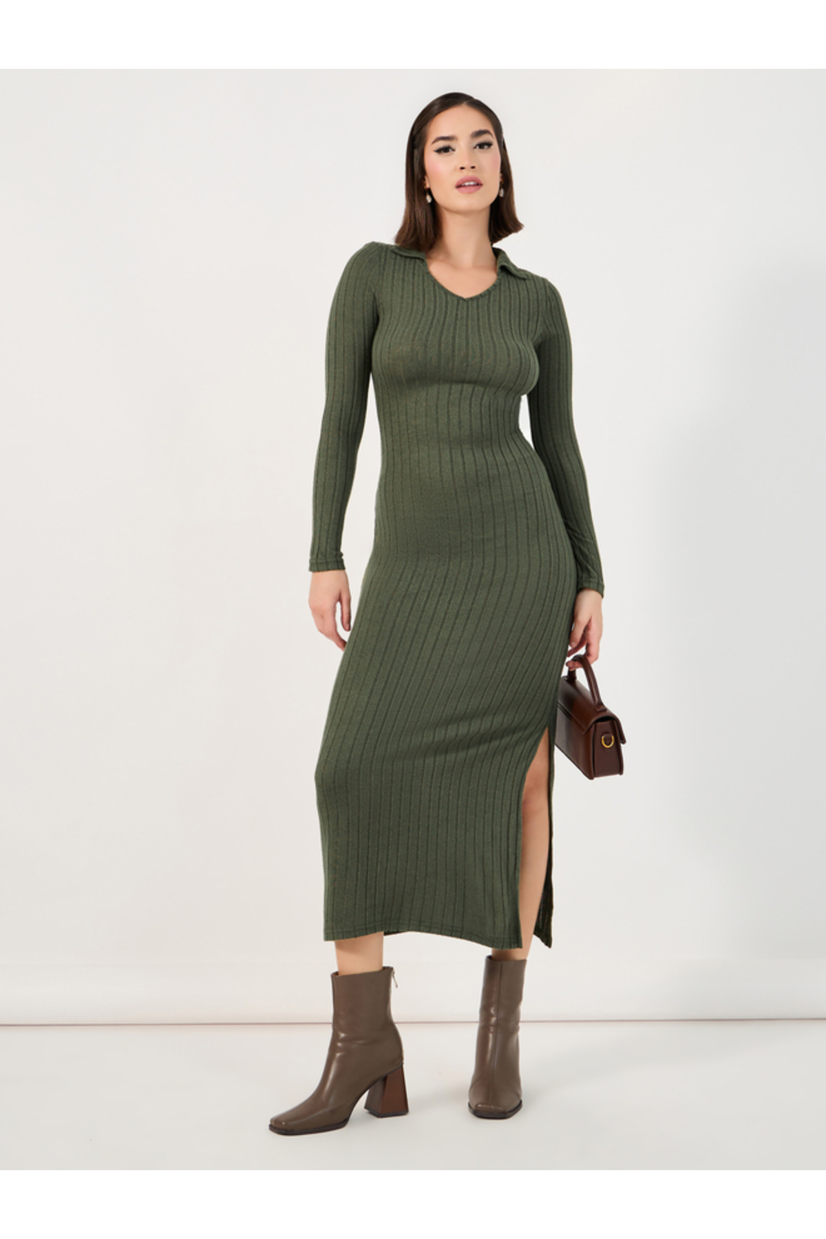 فستان ماكسي ضيق بياقة محبوكة وفتحة جانبية