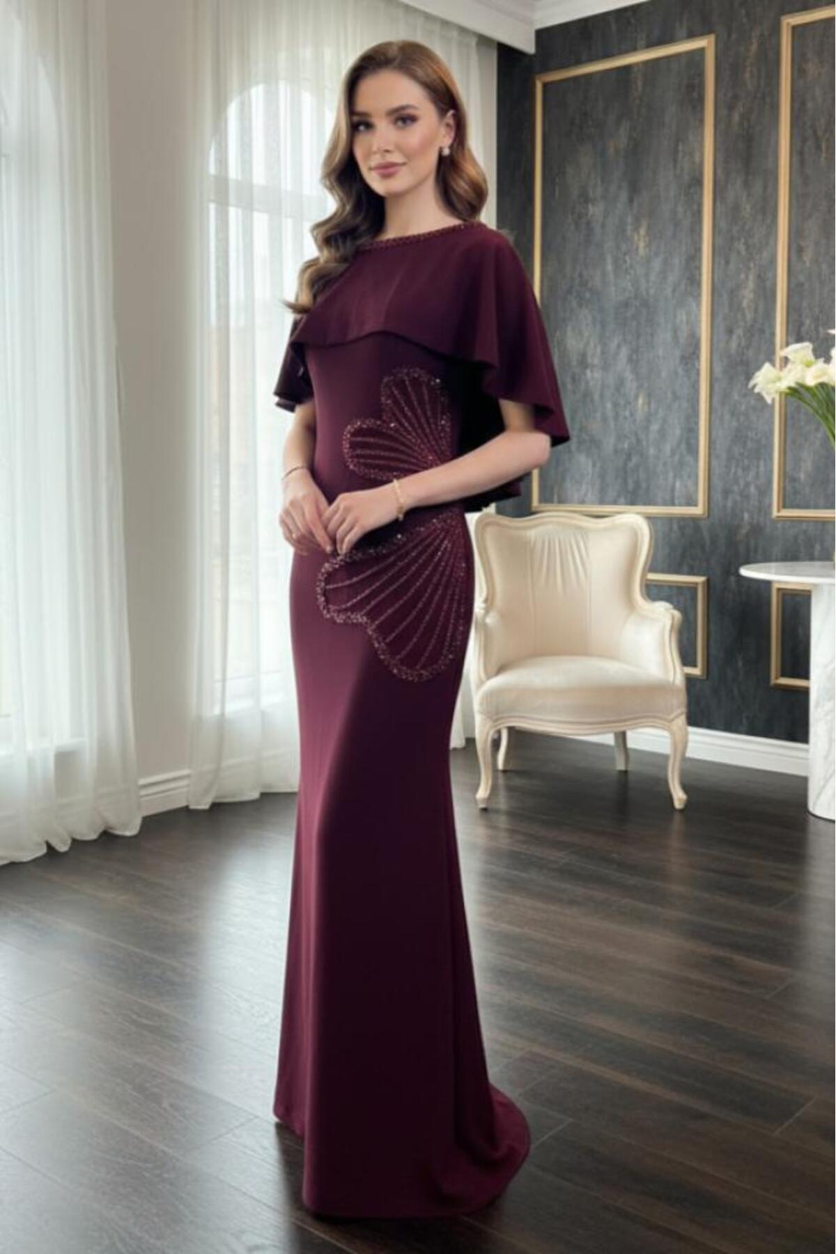 فستان سهرة برغندي كريب بقصة سمكة