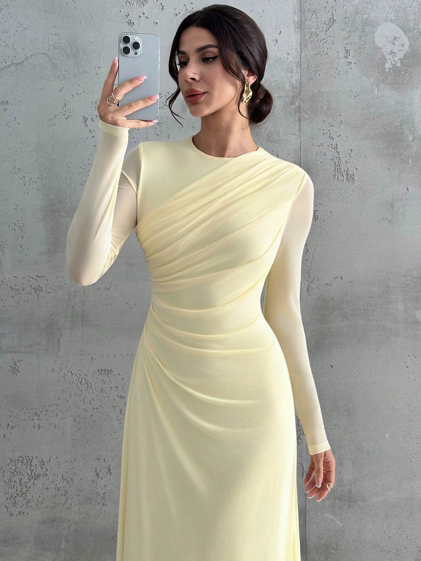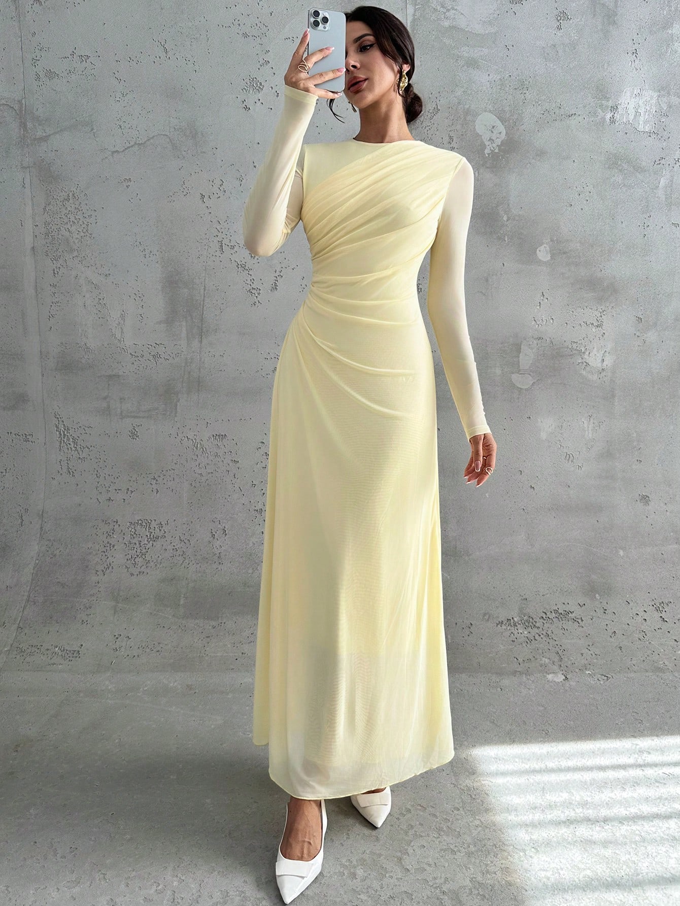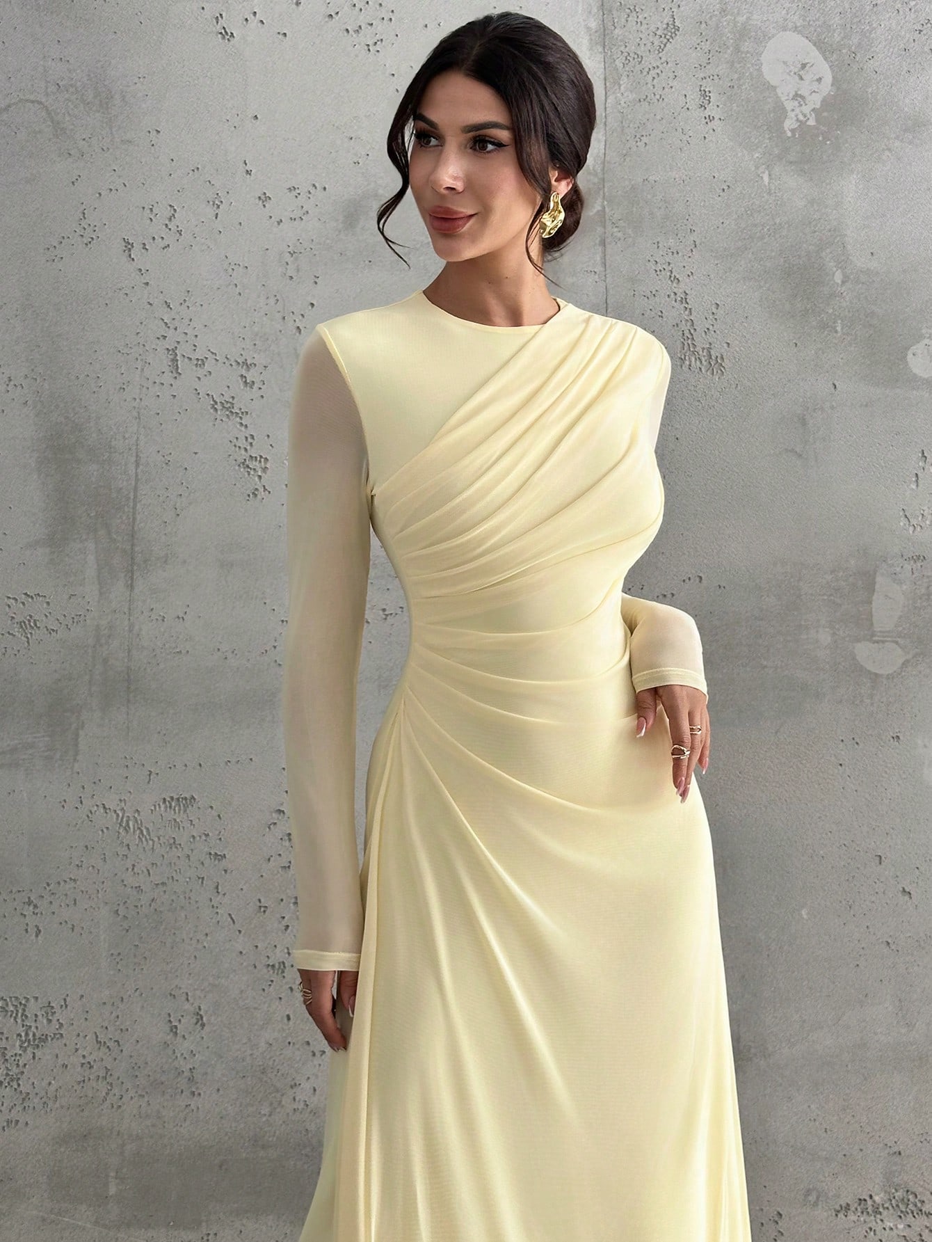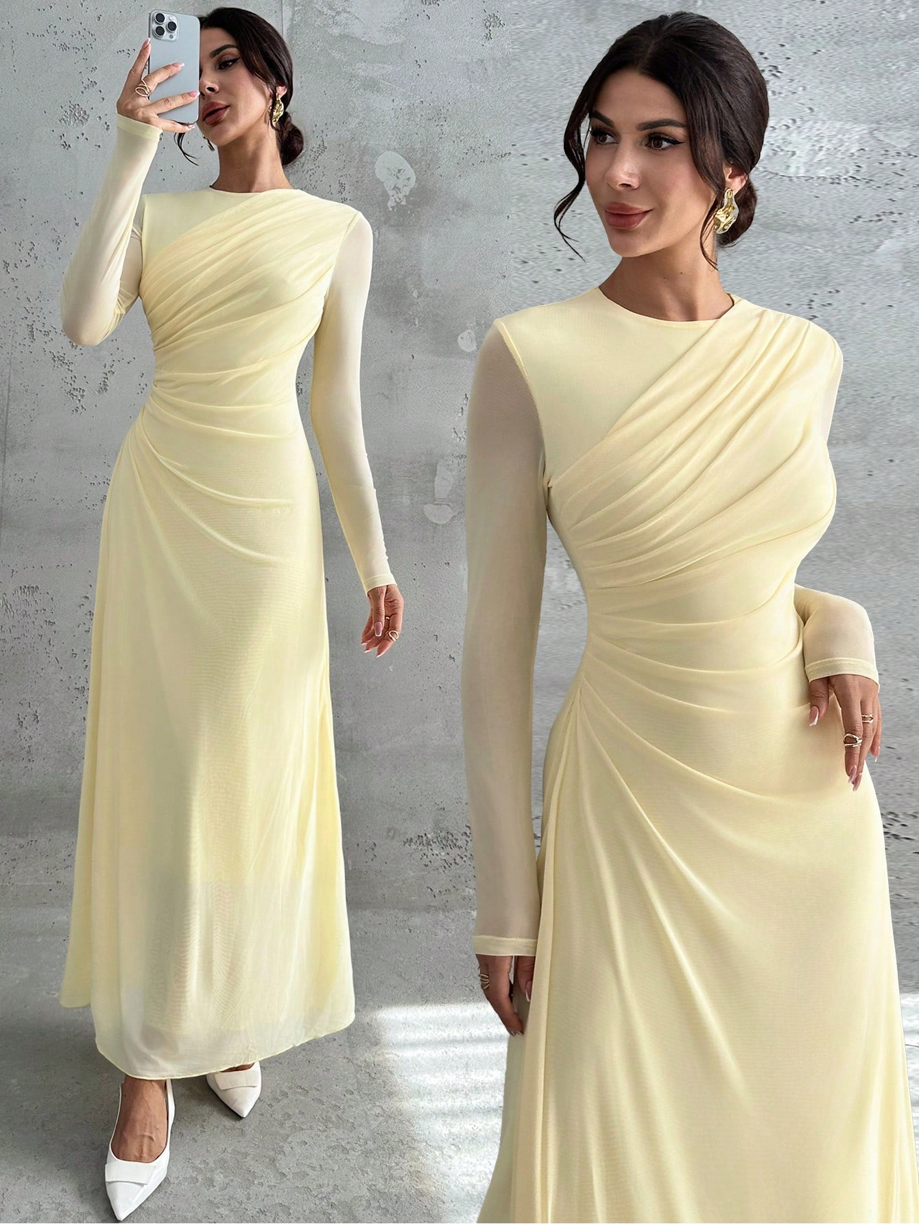 فستان ماكسي أنيق للنساء بأكمام طويلة وياقة مستديرة وخصر منتفخ
