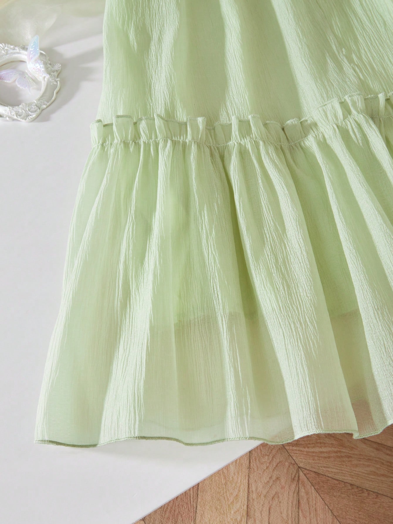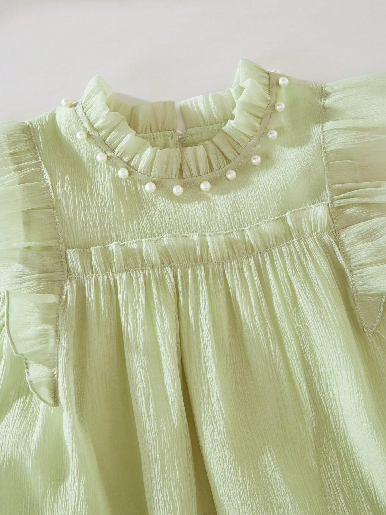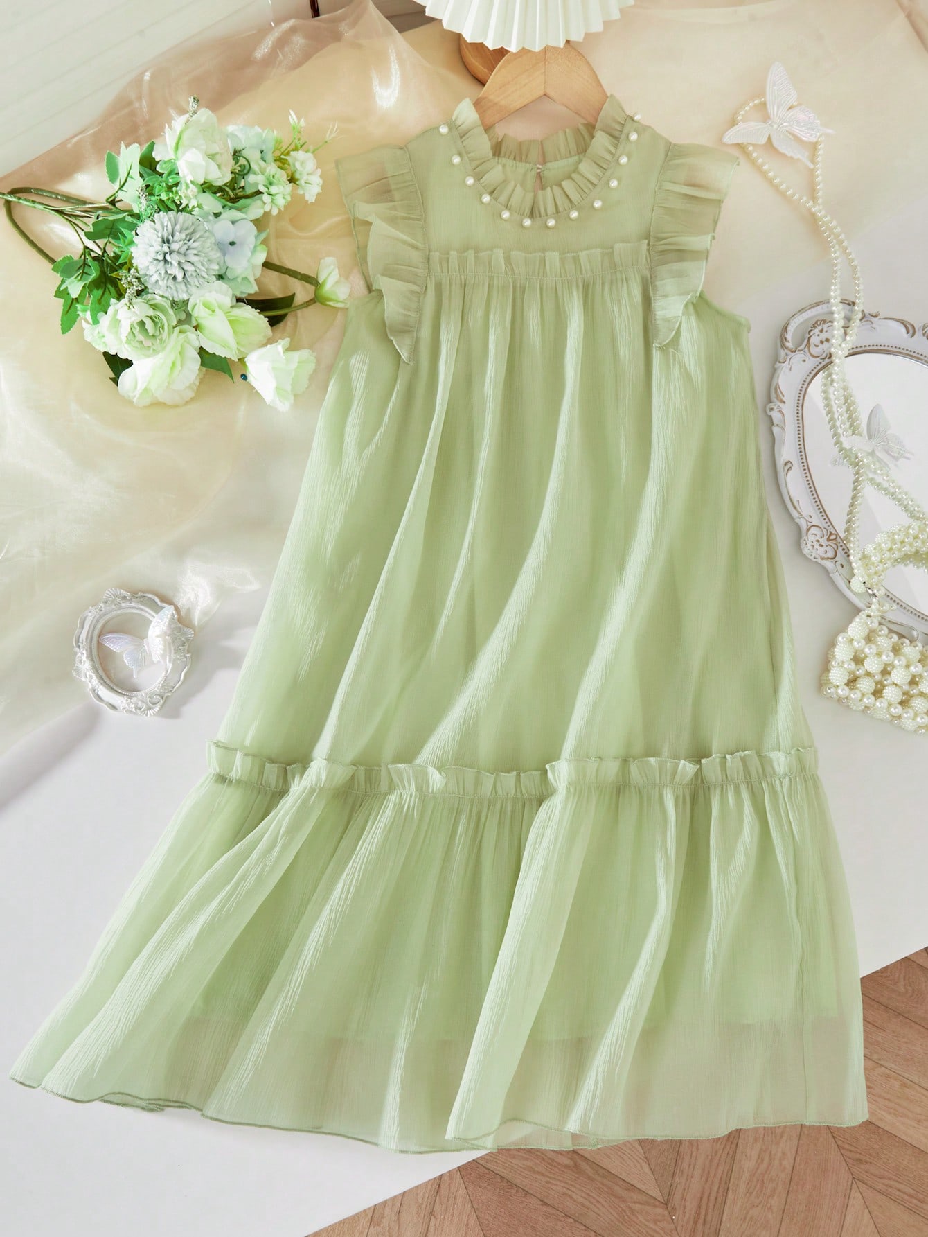 فستان بناتي بياقة مستديرة وبدون أكمام مزين باللؤلؤ والدانتيل والشبكة، فستان أميرة
