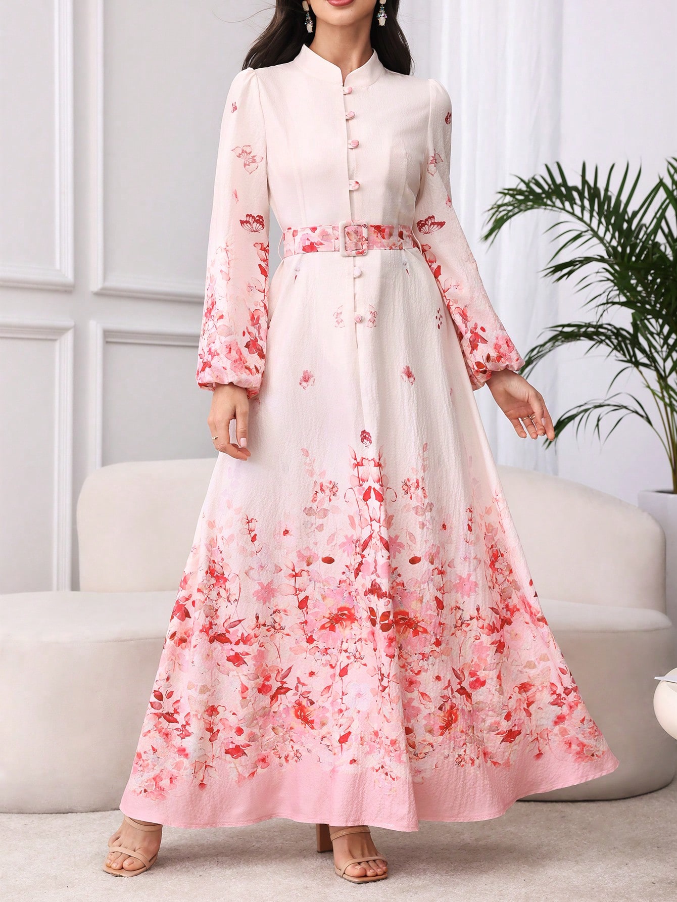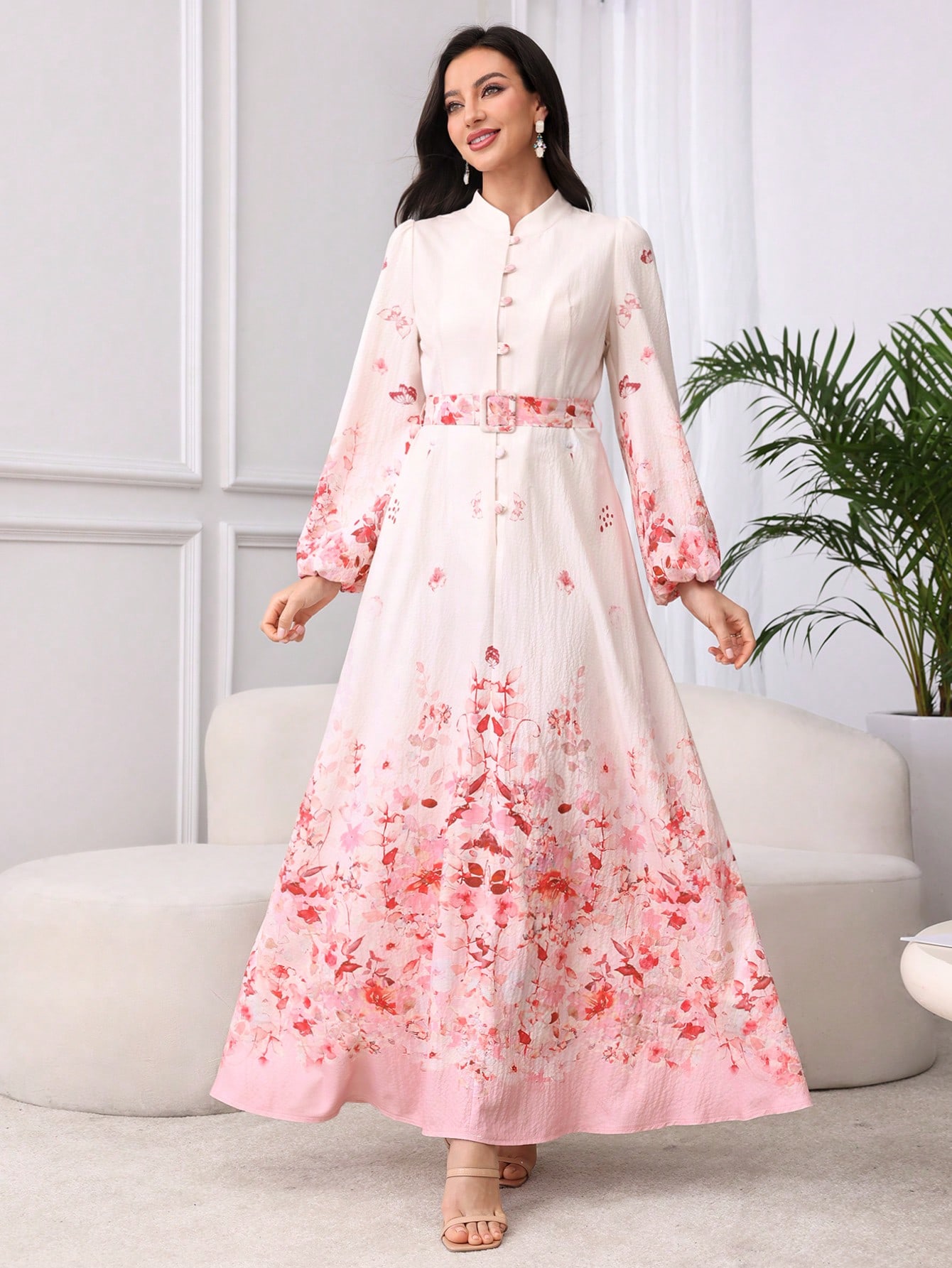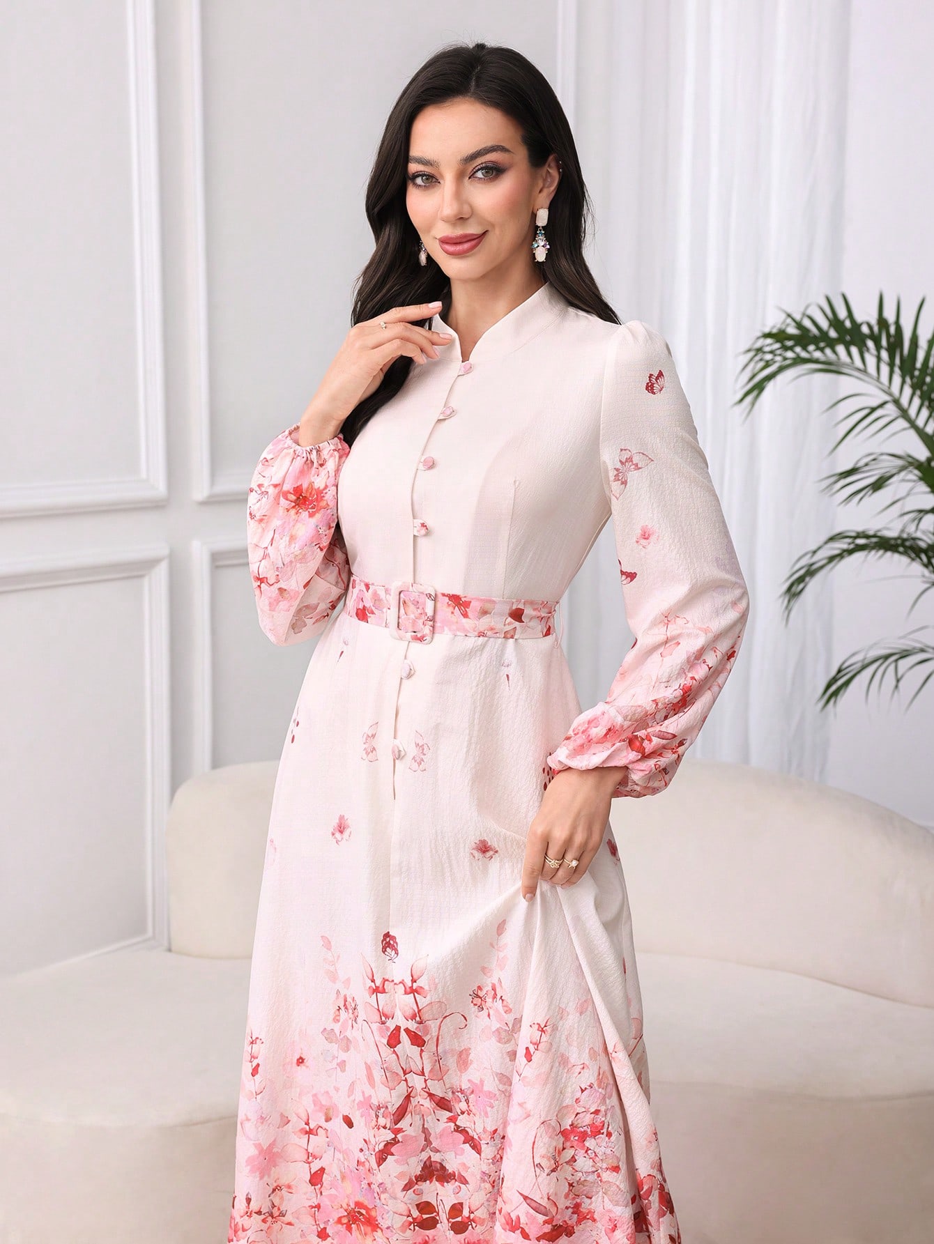 فستان مزين بحزام ذو ياقة عالية