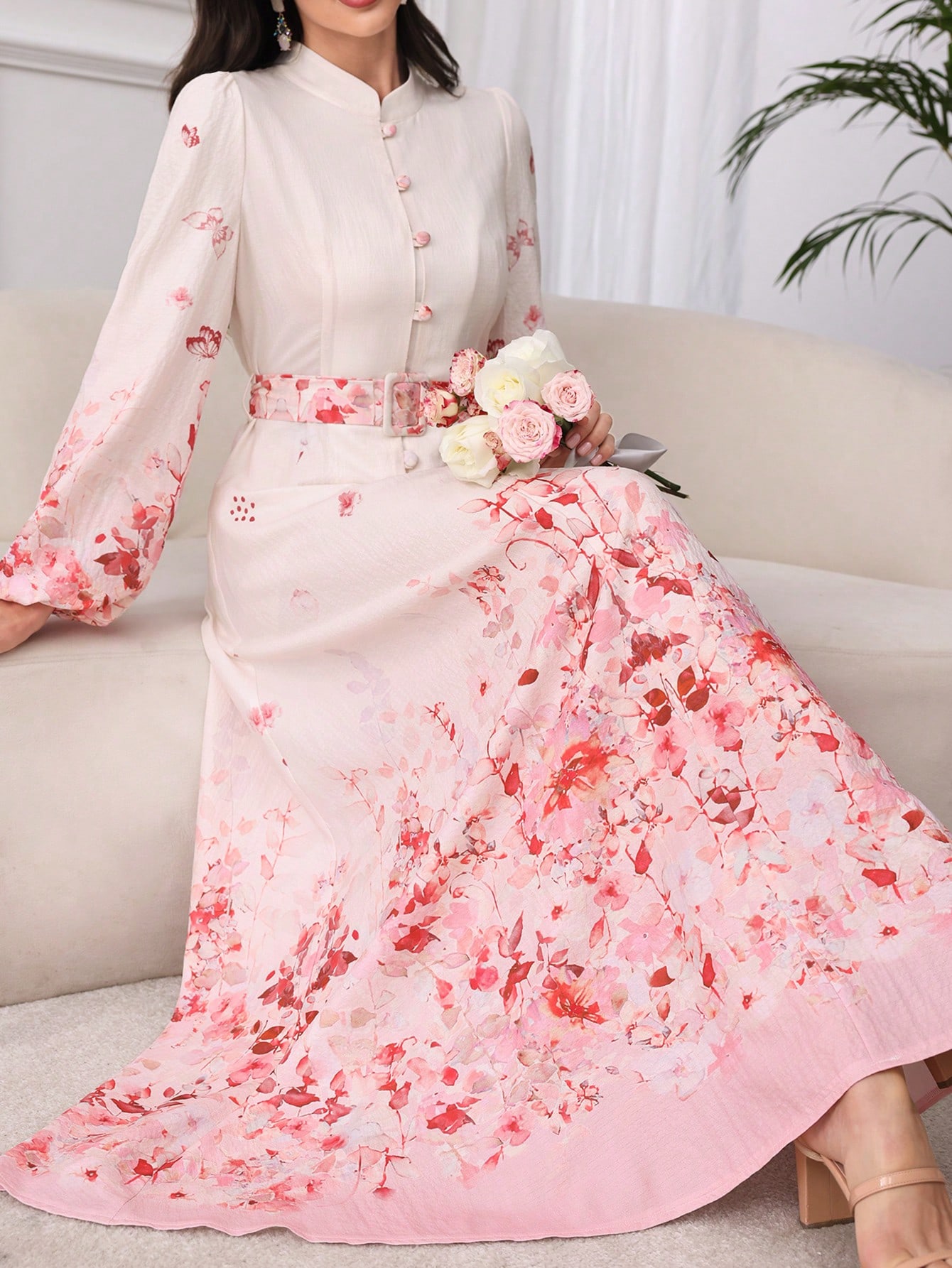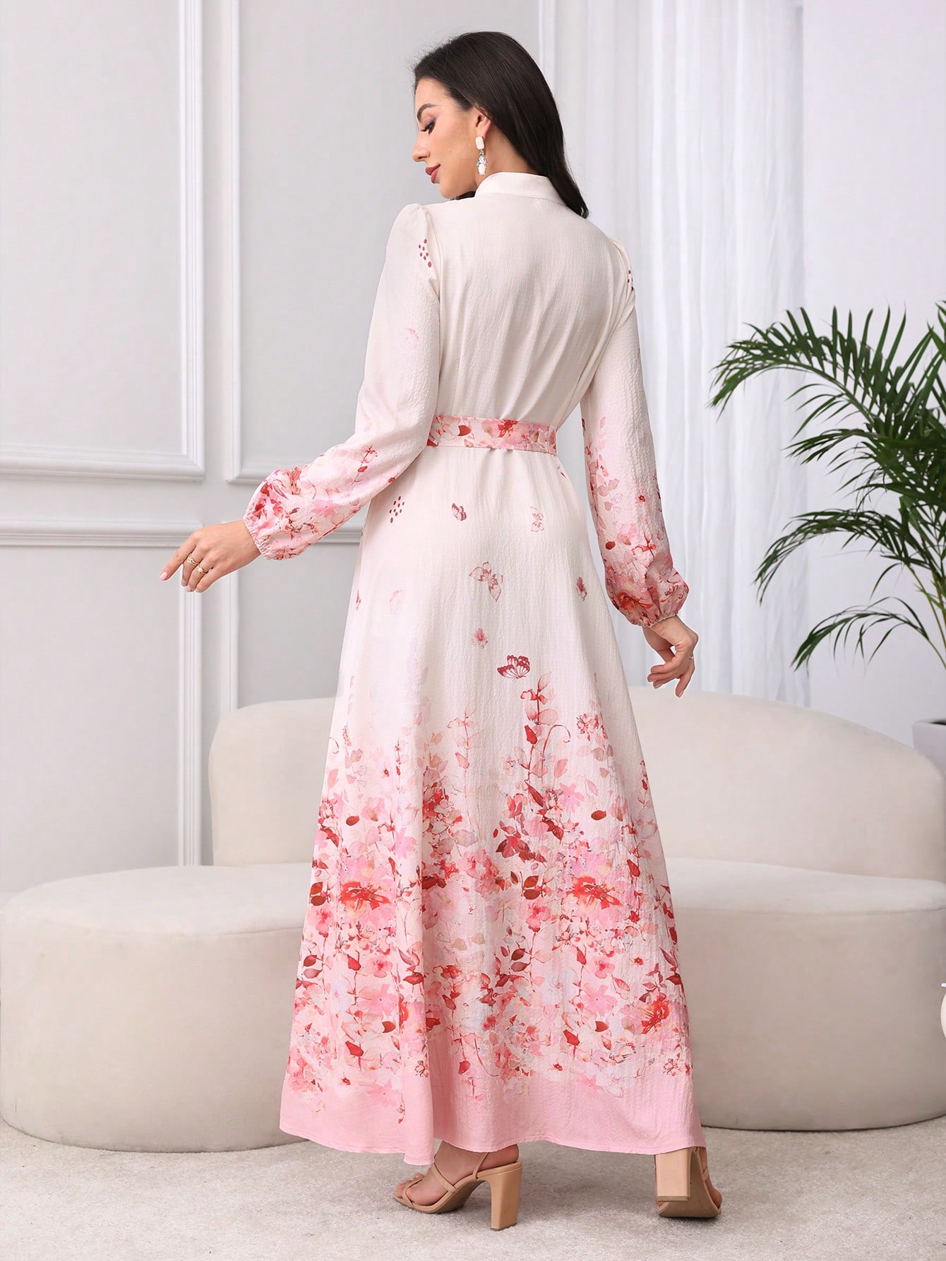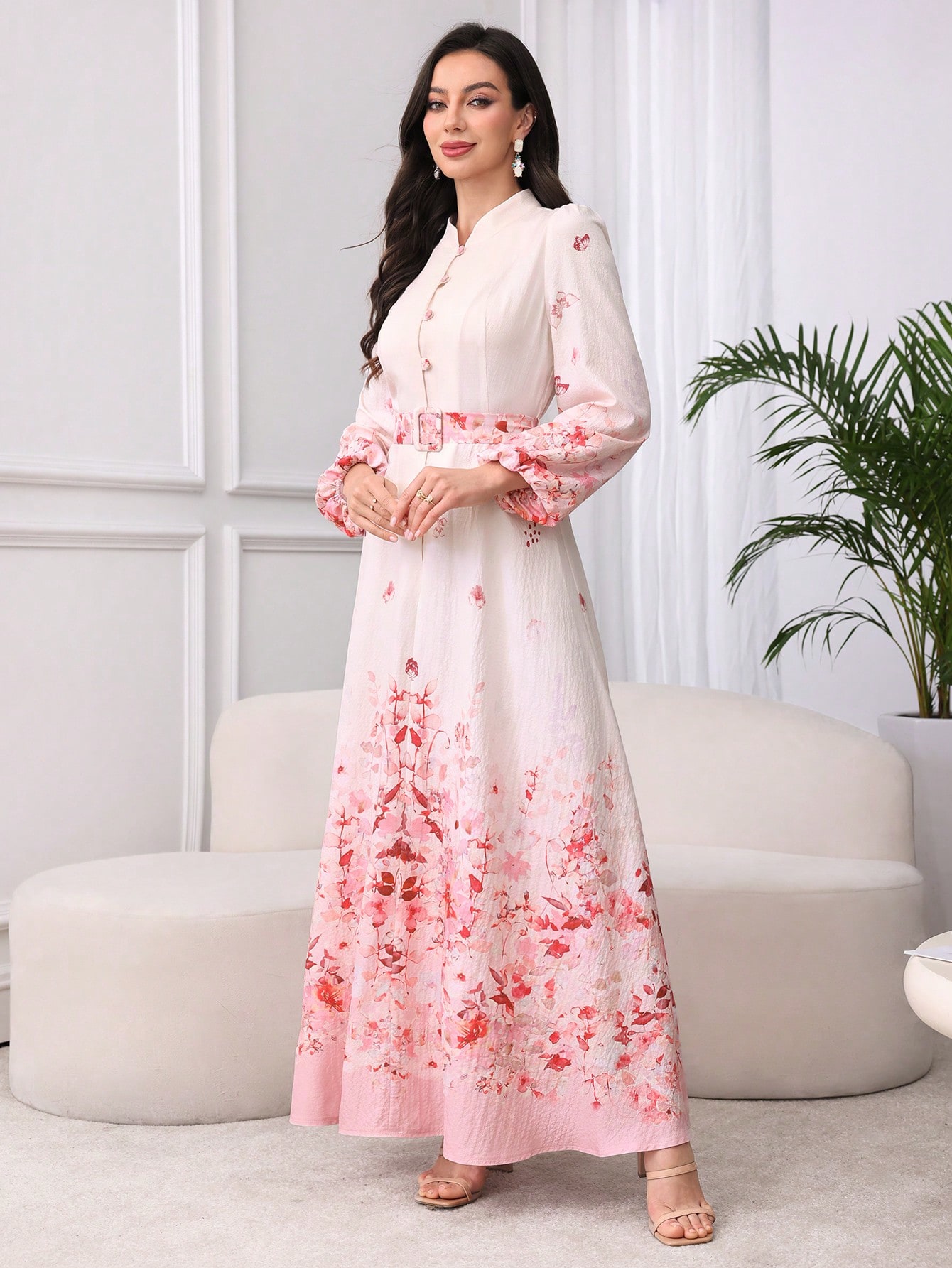 فستان مزين بحزام ذو ياقة عالية