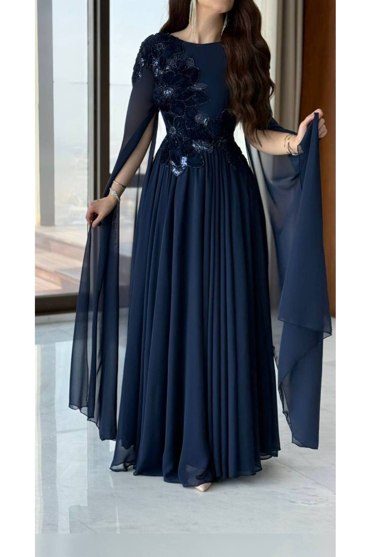 فستان كحلي فخم بكاب طويل و تطريز ورود بارز