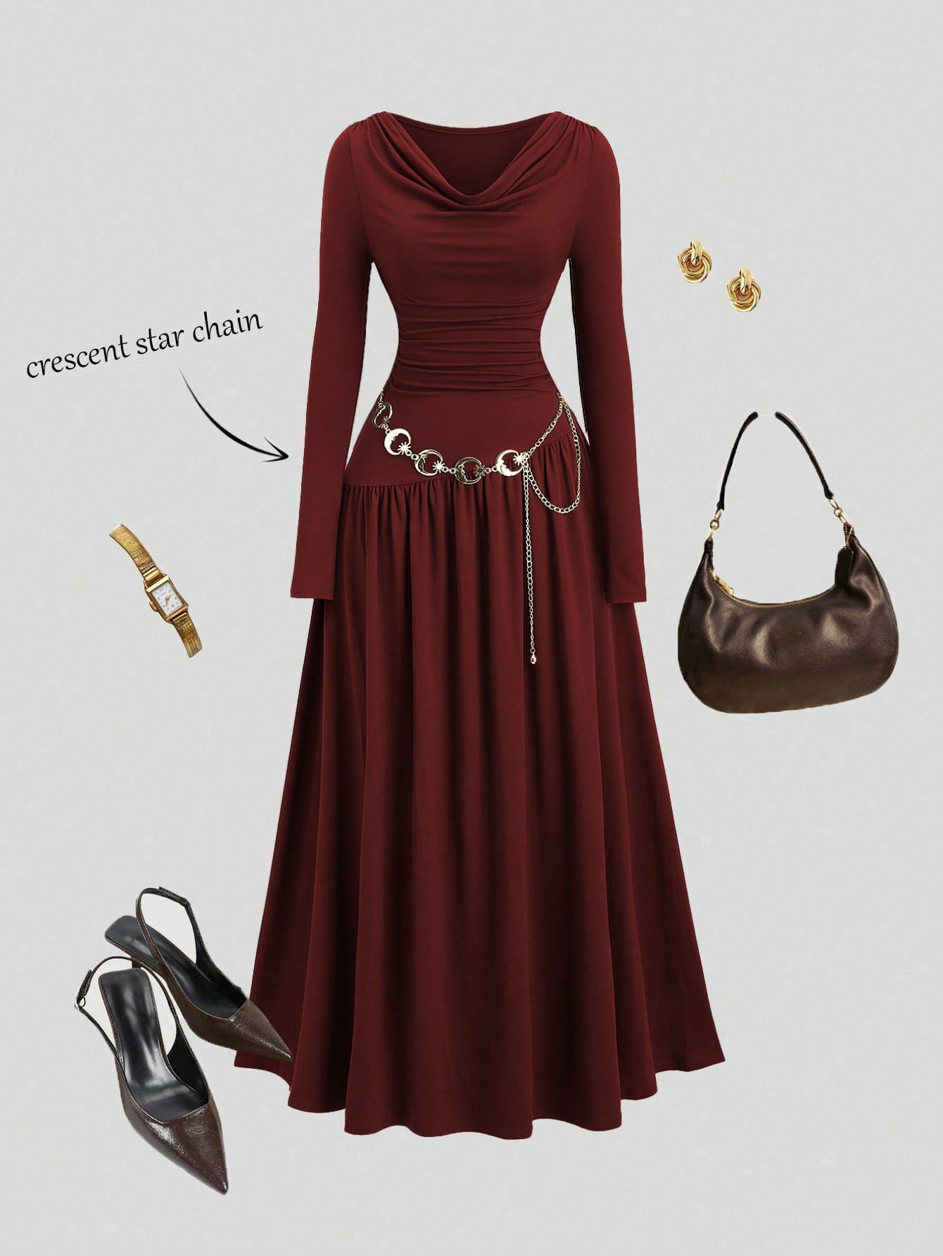 فستان أنيق بأكمام طويلة وياقة عميقة باللون البني الداكن