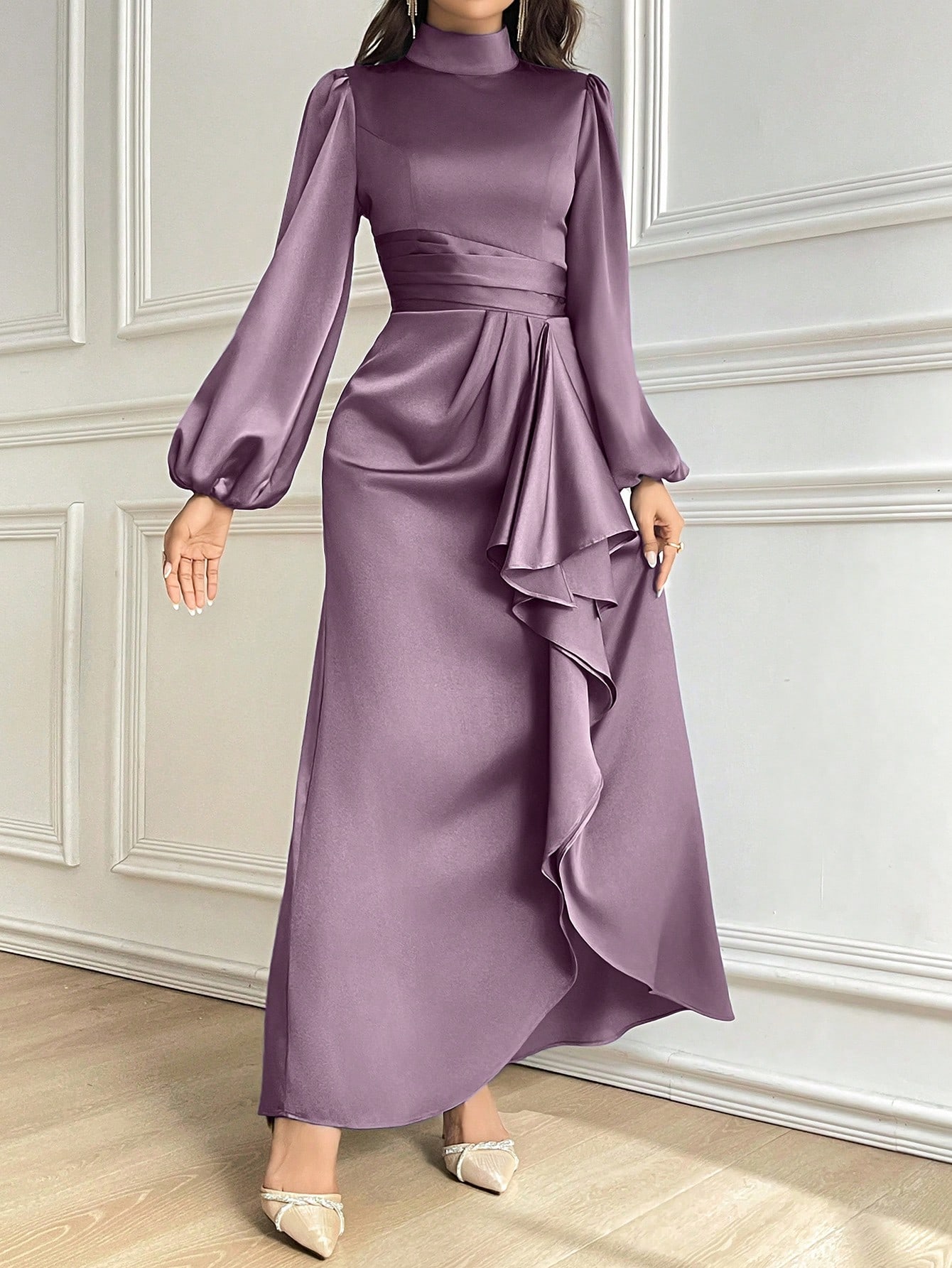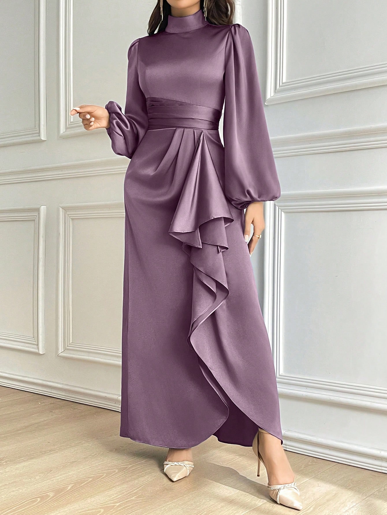 فستان أنيق للنساء بأكمام طويلة ذو ياقة عالية وذيل مكرمل