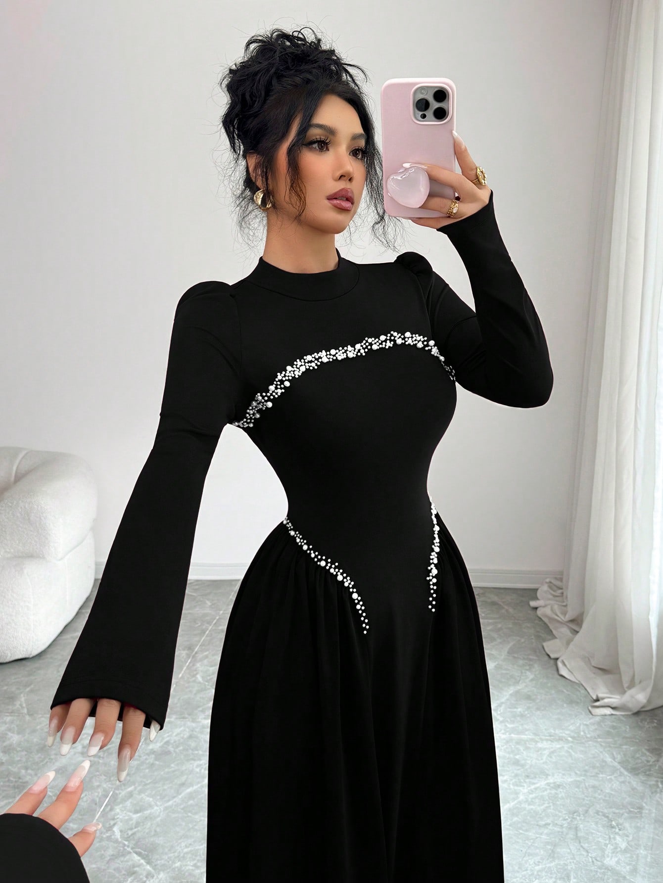 فستان أنيق طويل أحمر مزين بالخرز للنساء