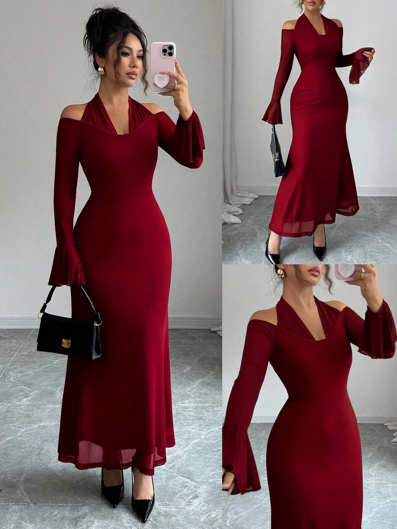 فستان نسائي أنيق بياقة حلقية وأكمام واسعة وطويلة