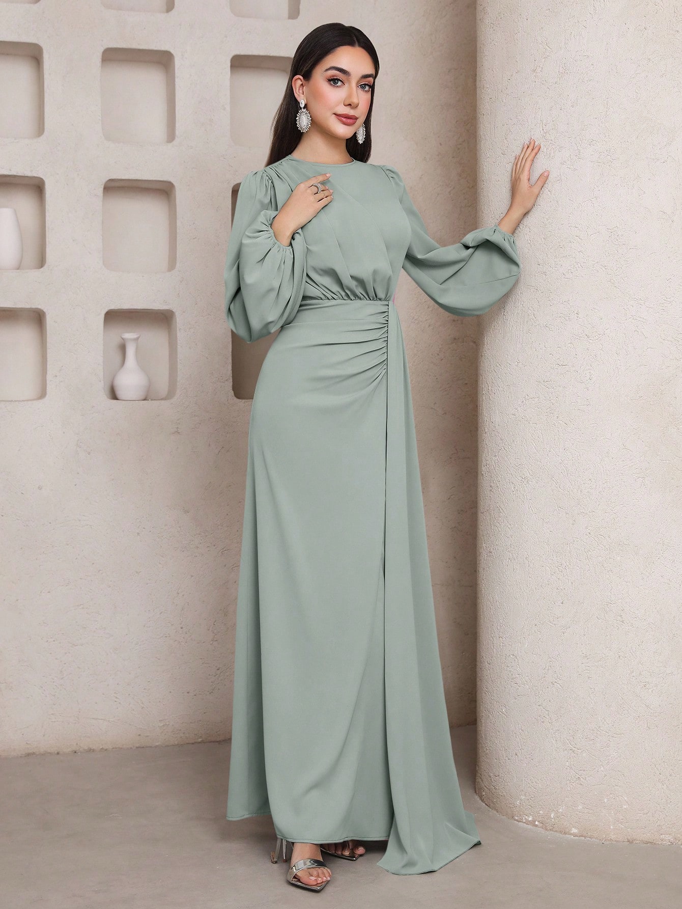 فستان نسائي أنيق أحادي اللون ذو رقبة مستديرة
