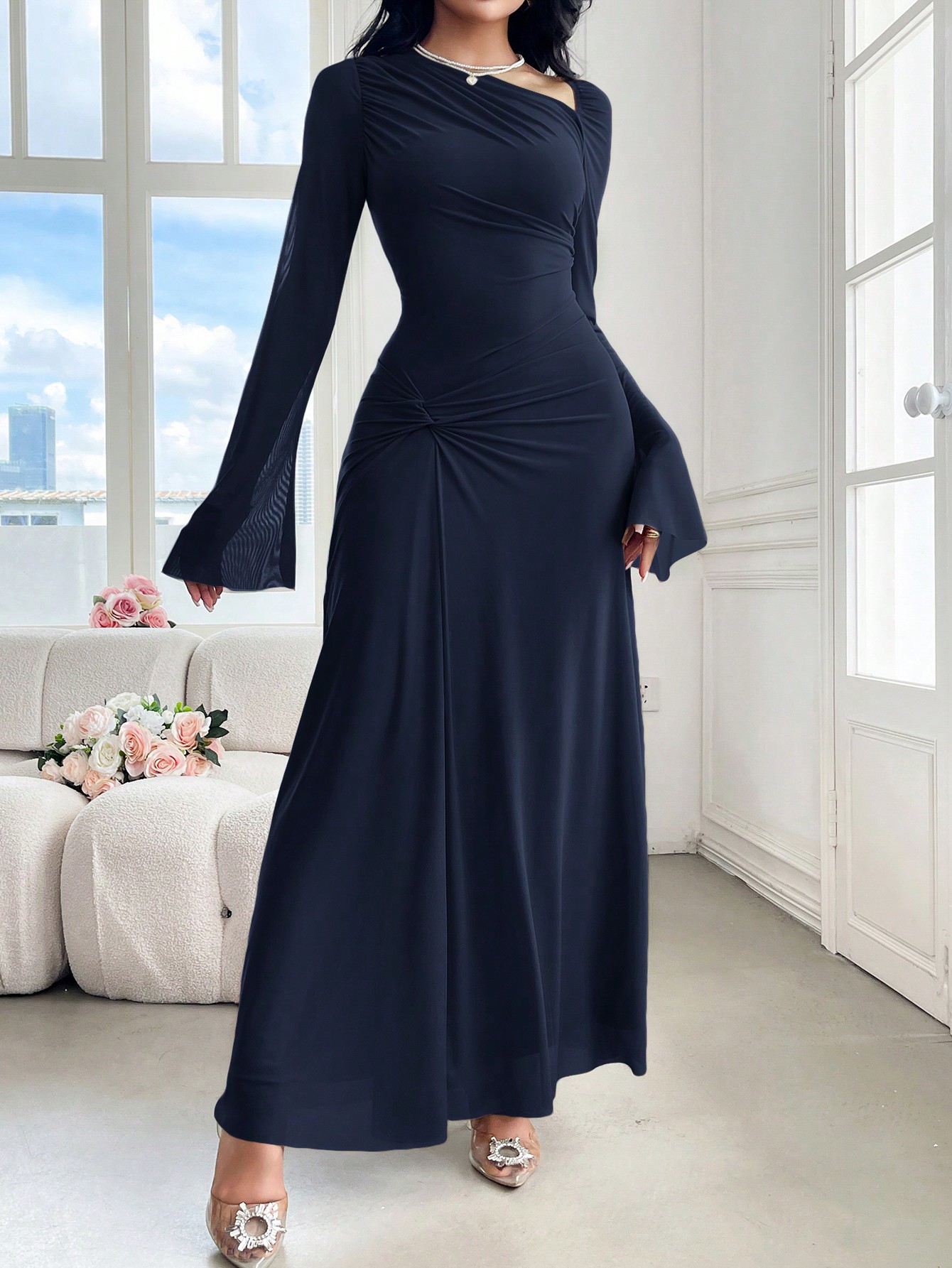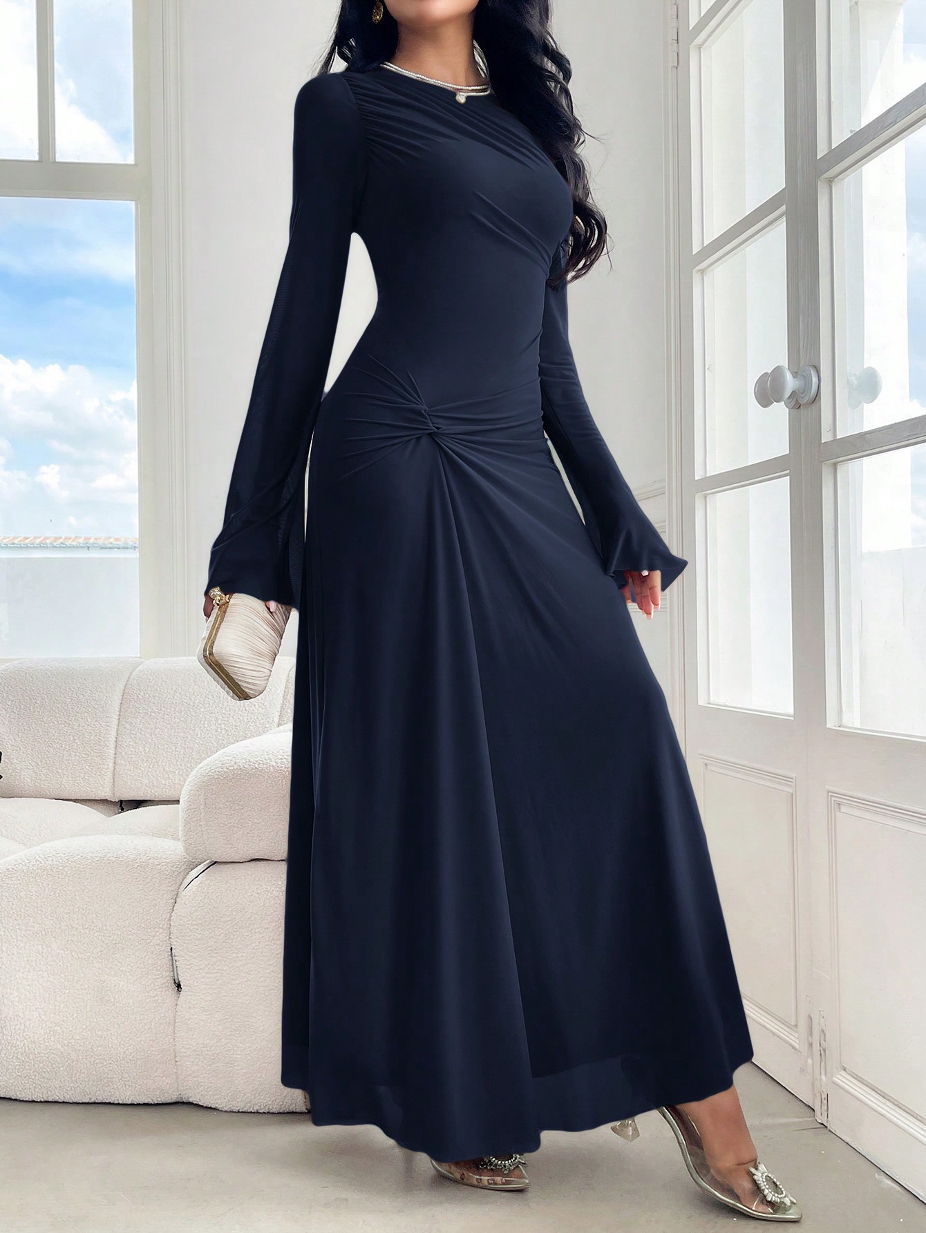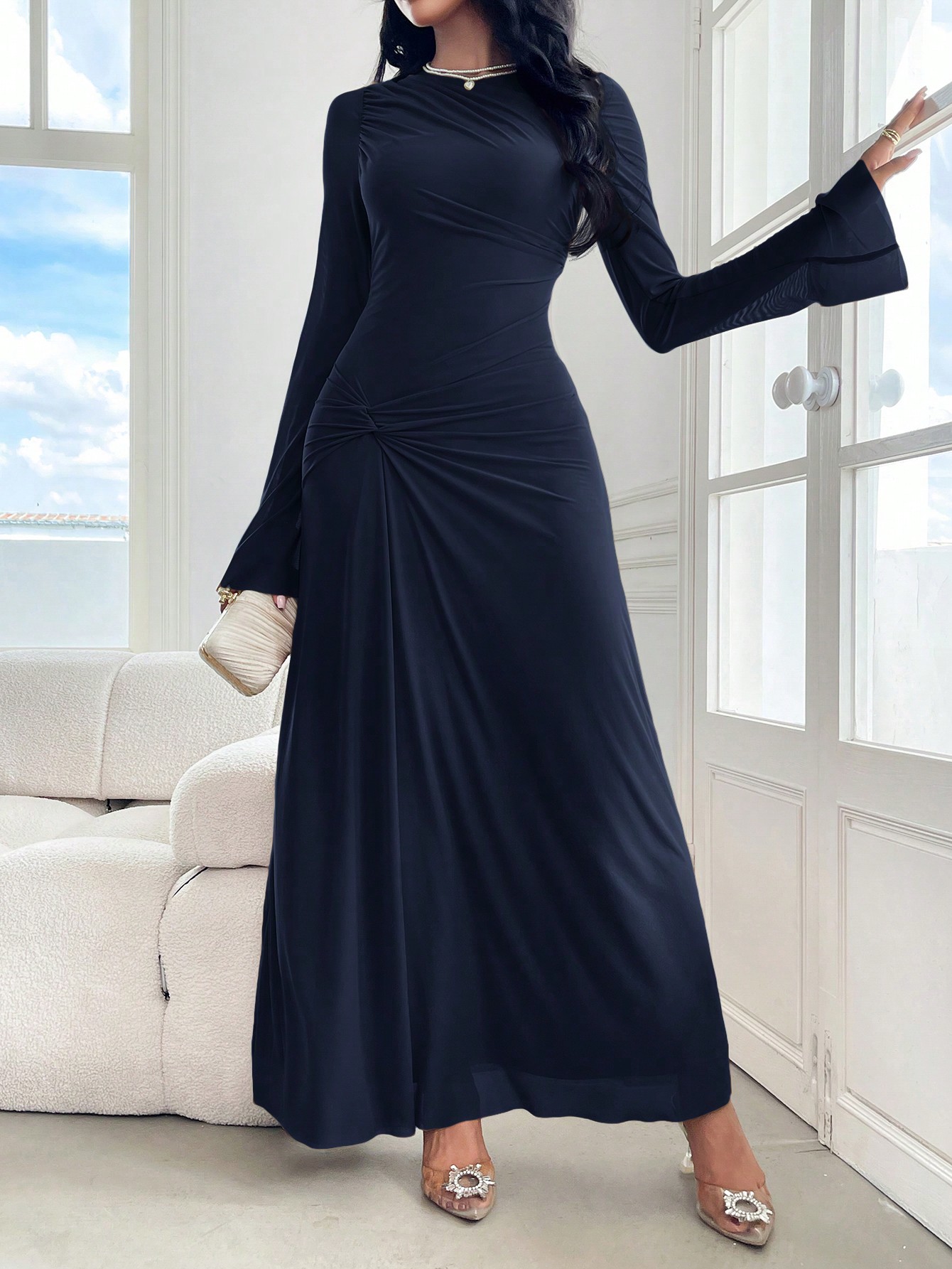 فستان طويل أنيق بتصميم ملفوف بياقة مستديرة وأكمام طويلة
