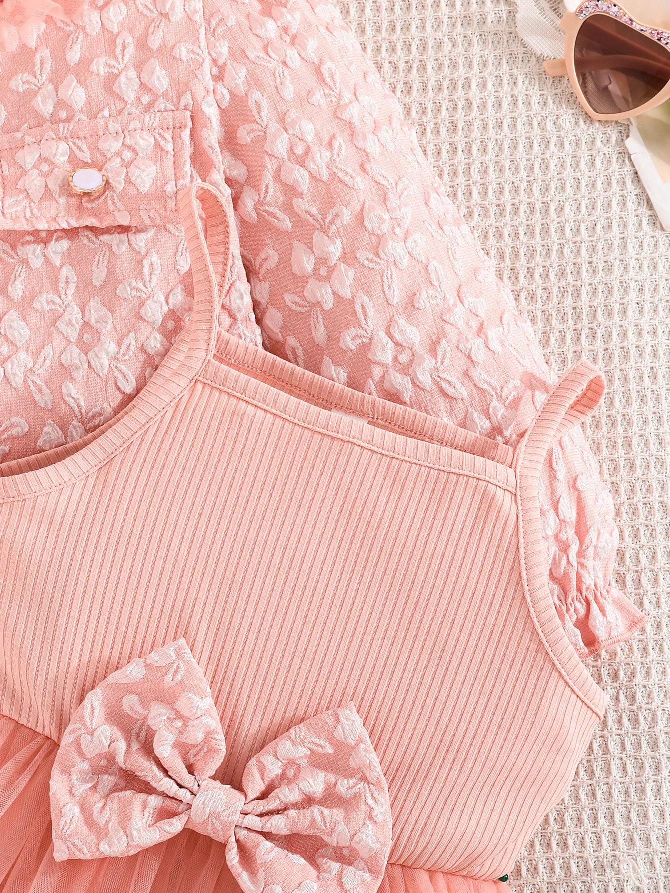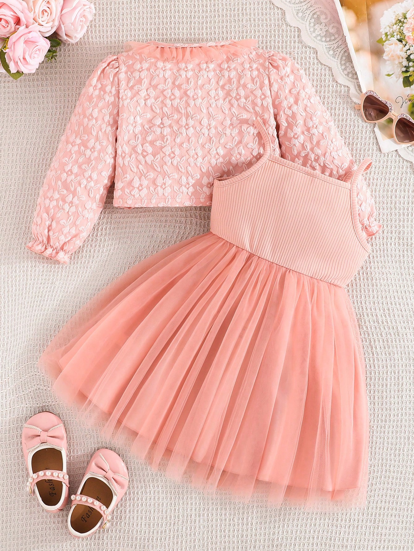 جاكيت + فستان شبكي مخطط بفيونكة، هدية عيد ميلاد بنات.