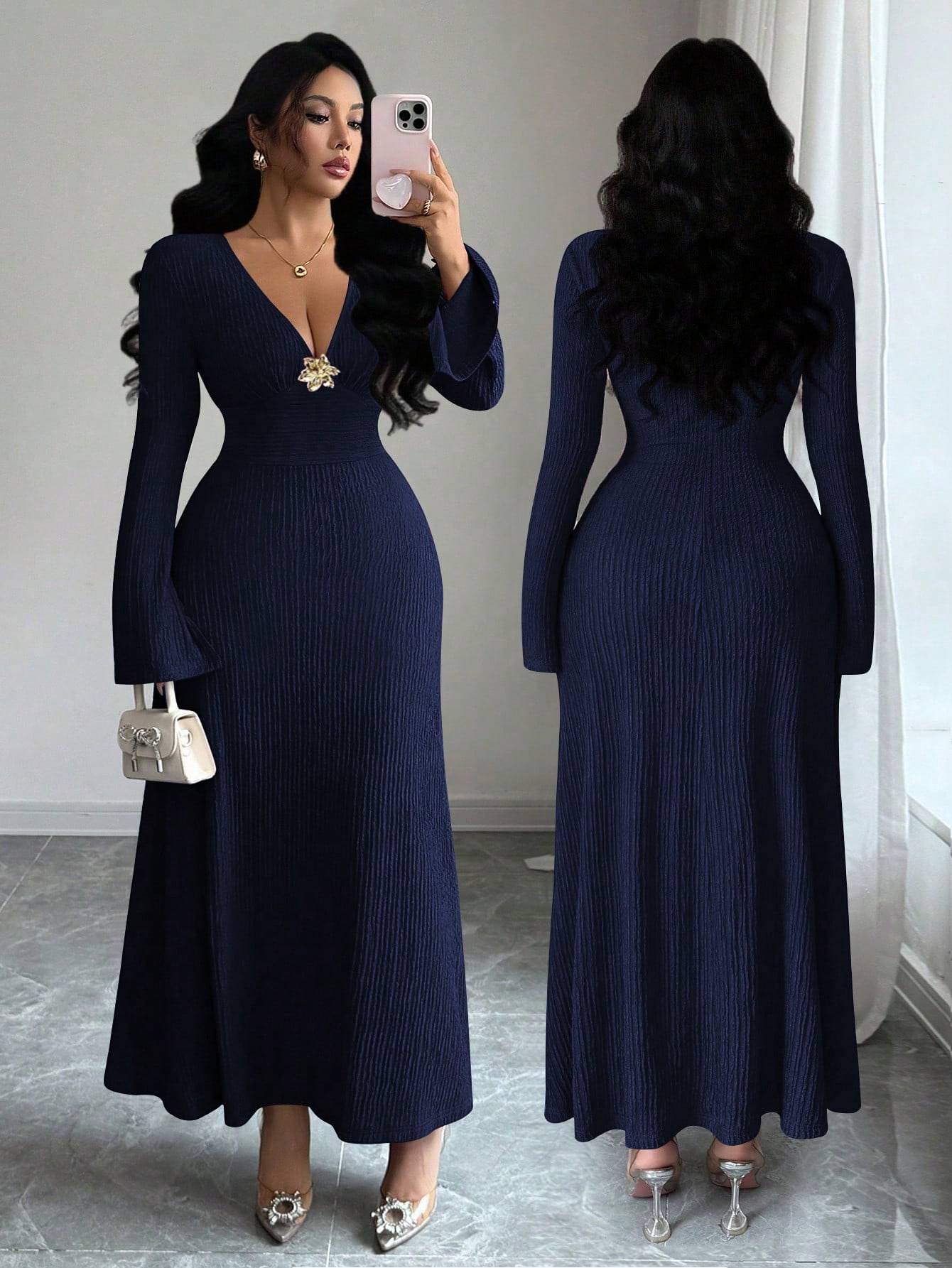 فستان متوسط الطول بأكمام واسعة وخصر ضيق