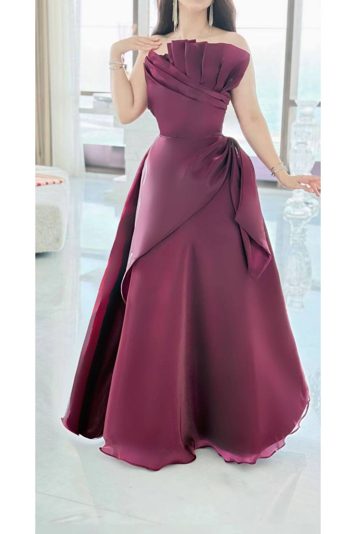 ستان سهرة برغندي ساتان أوف شولدر بطيات ملكية