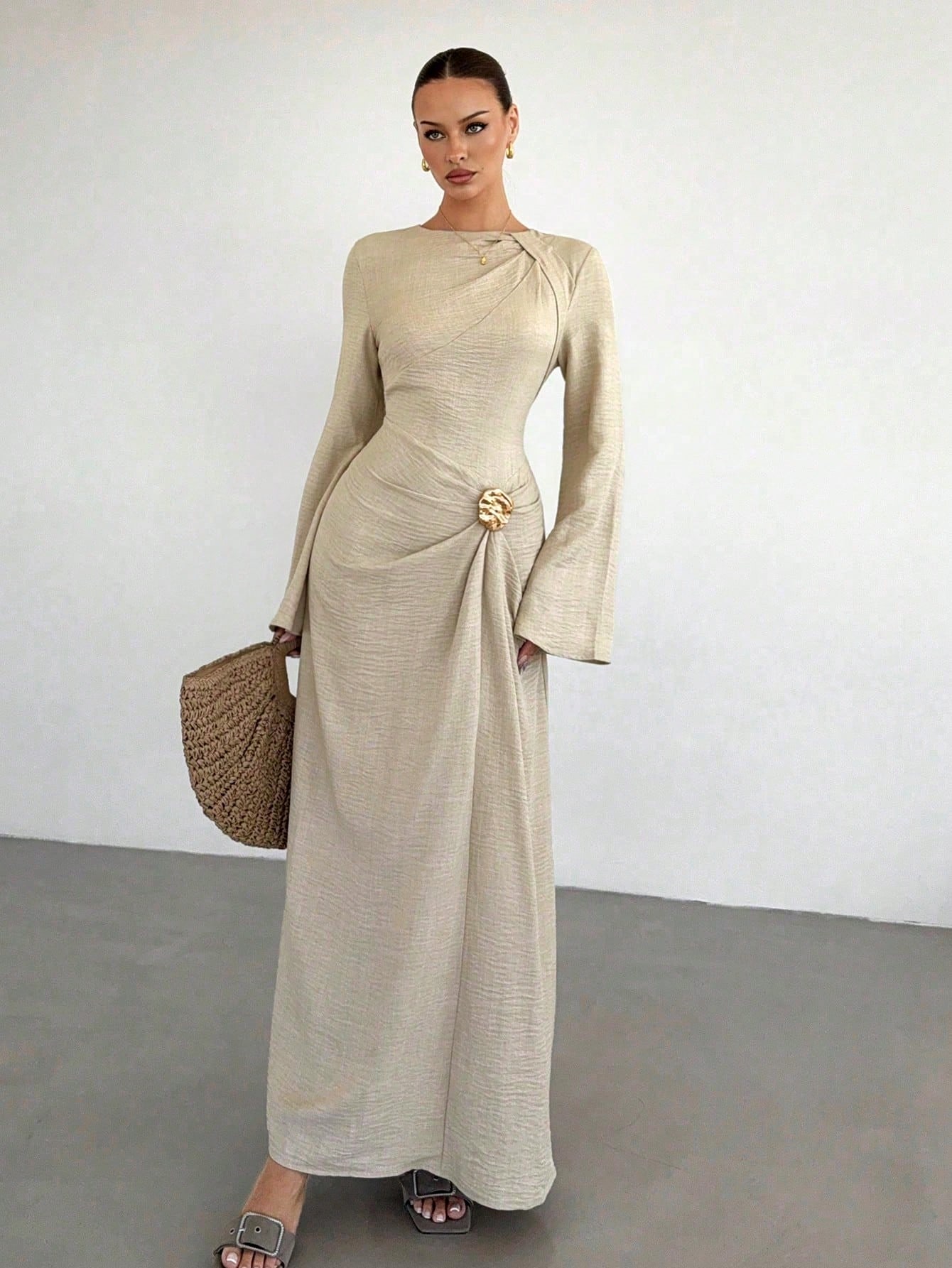 فستان نسائي رسمي طويل الأكمام، مفتوح ومزين بإبزيم