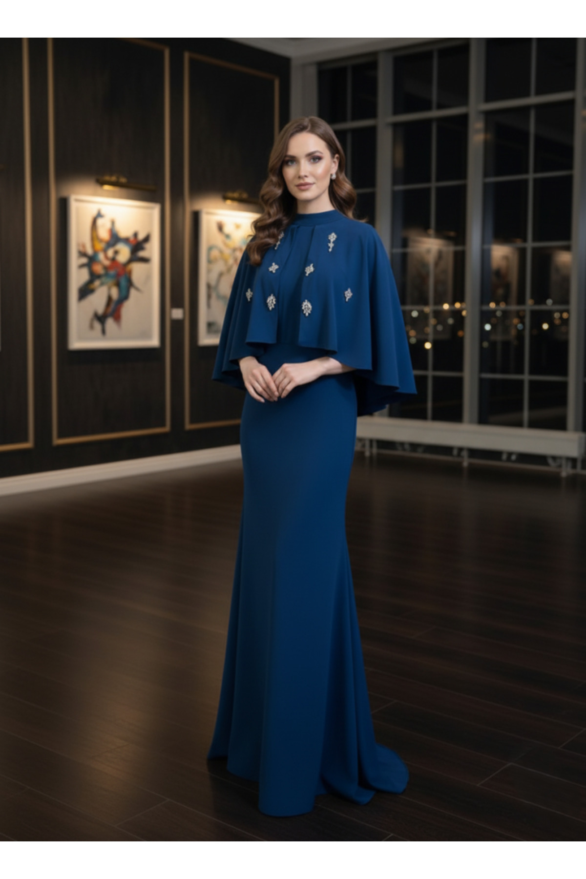 فستان سهرة كريب ناعم بقصة سمكة وكاب ملكي