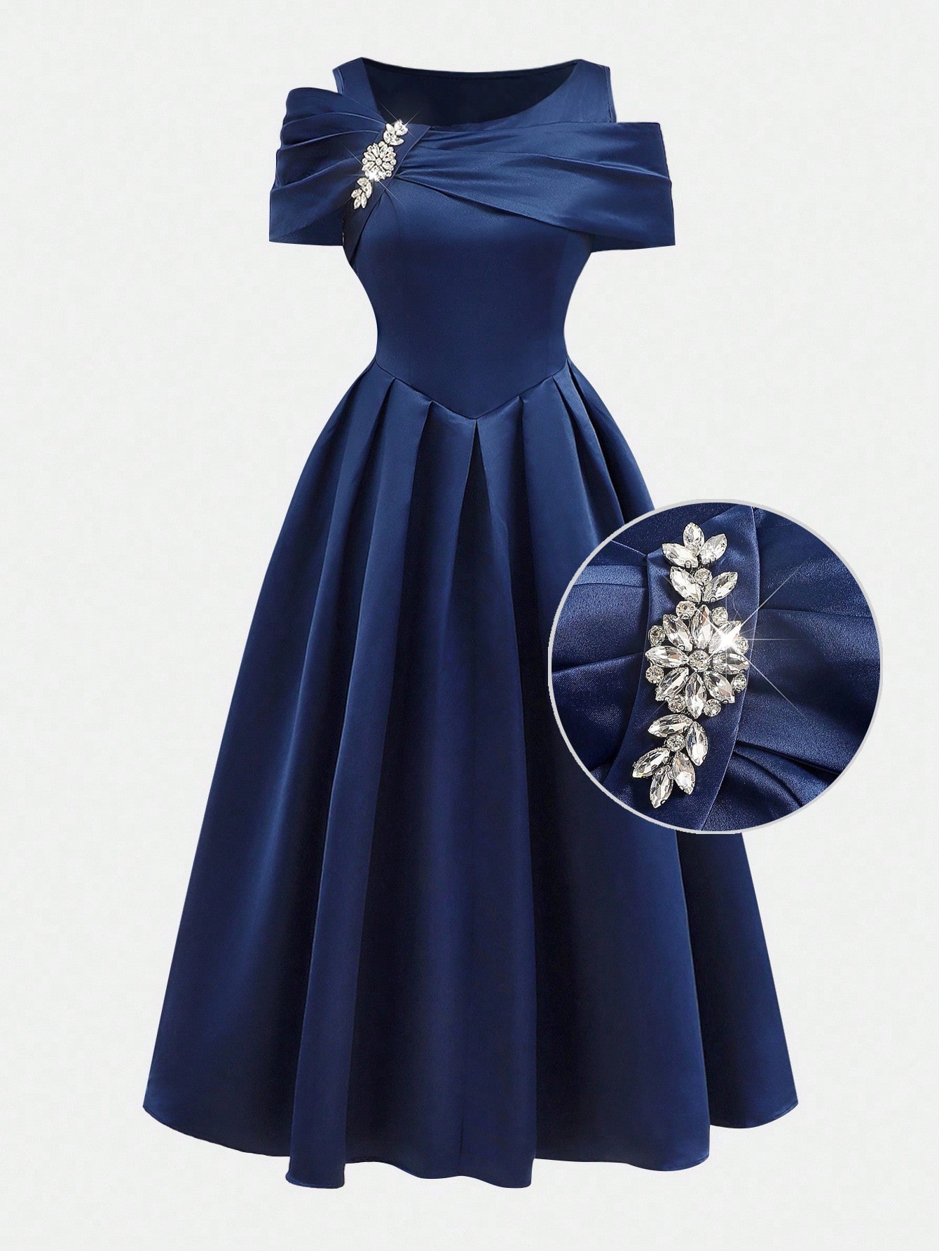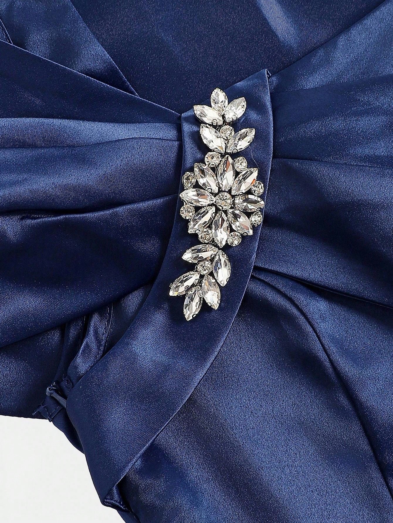 فستان سهرة مراهقات، أزرق داكن، ساتان، كتف واحد، شق.