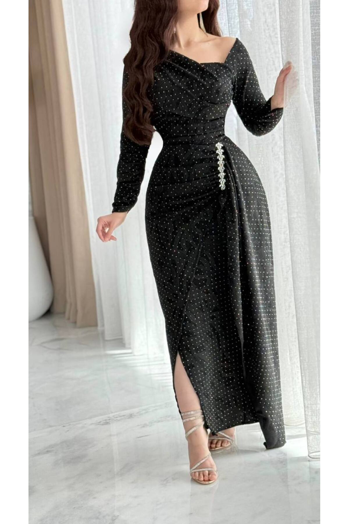 فستان سهرة أسود مرصع بكريستالات بتصميم لف أنيق مع شق أمامي