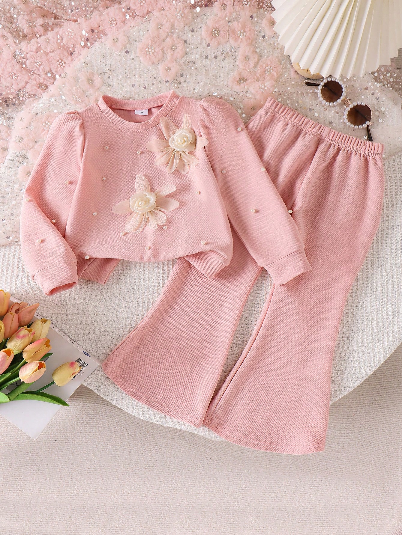 طقم بناتي: بلوزة أكمام طويلة مزينة بزهور وبنطلون واسع.