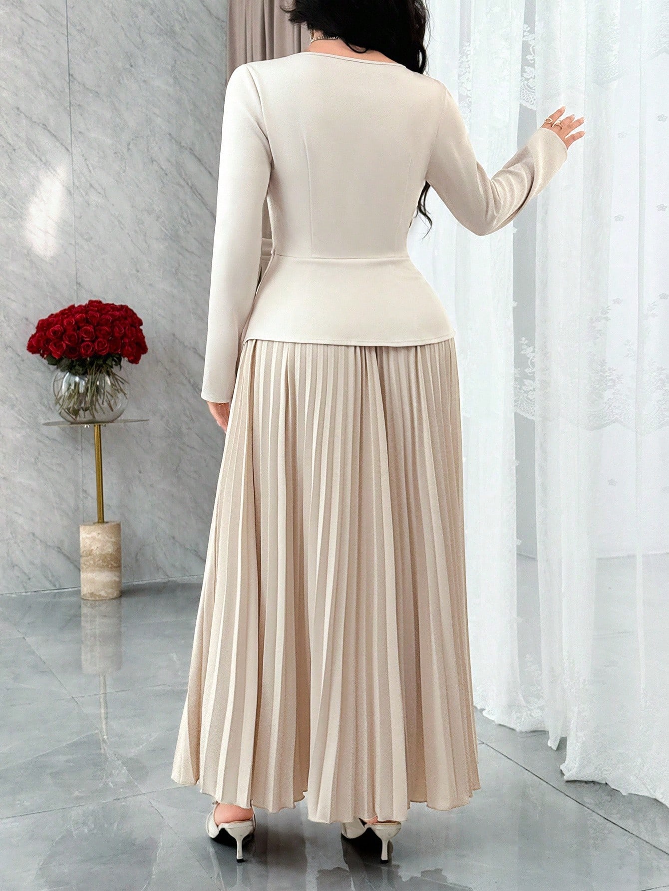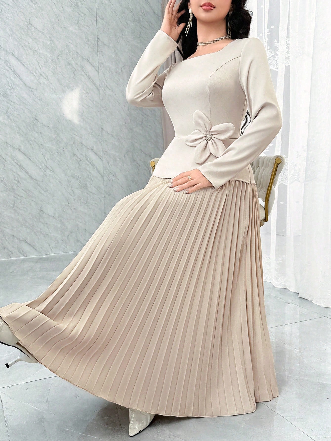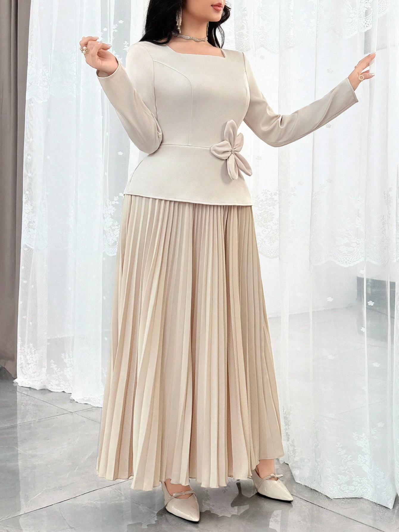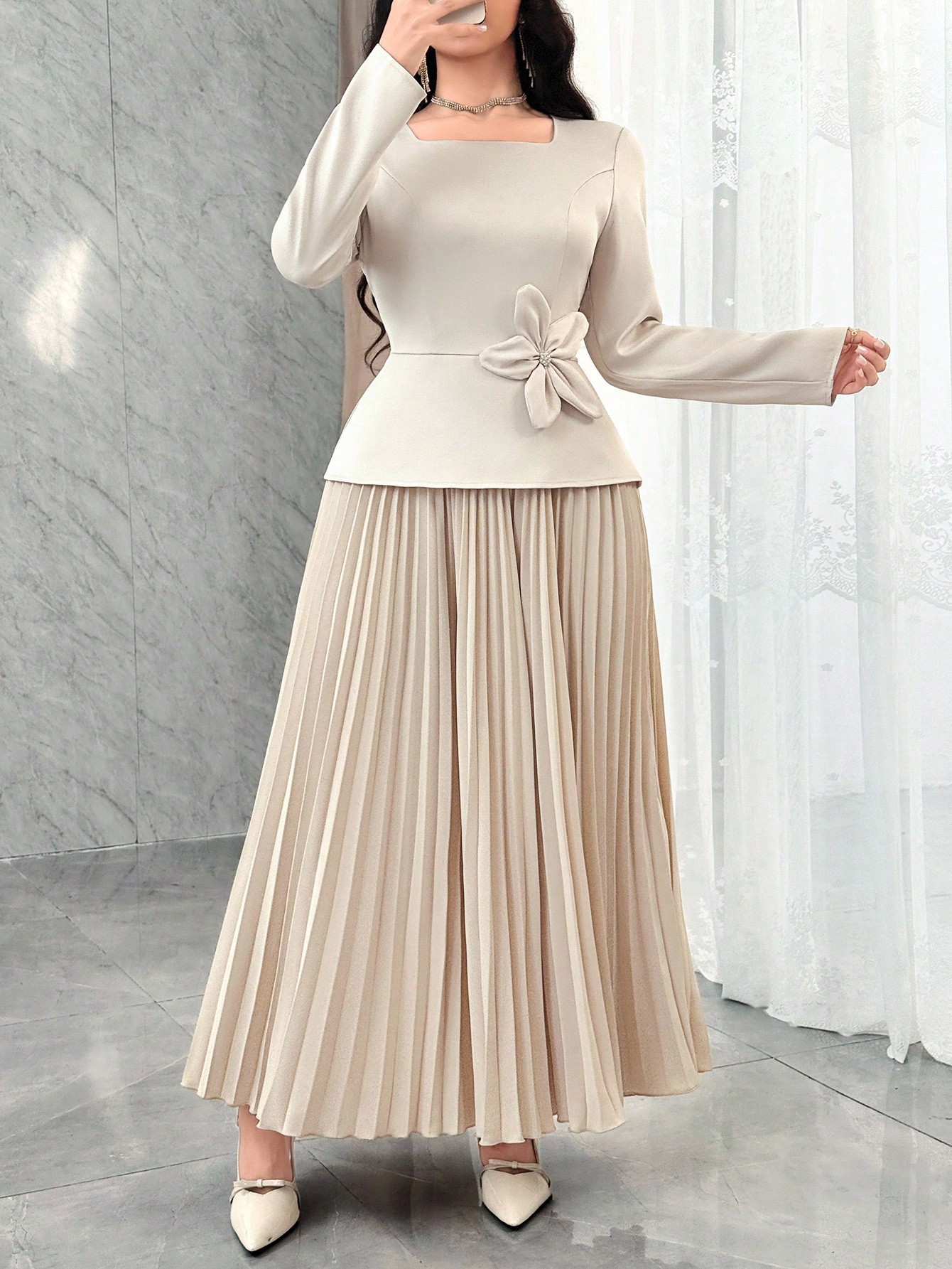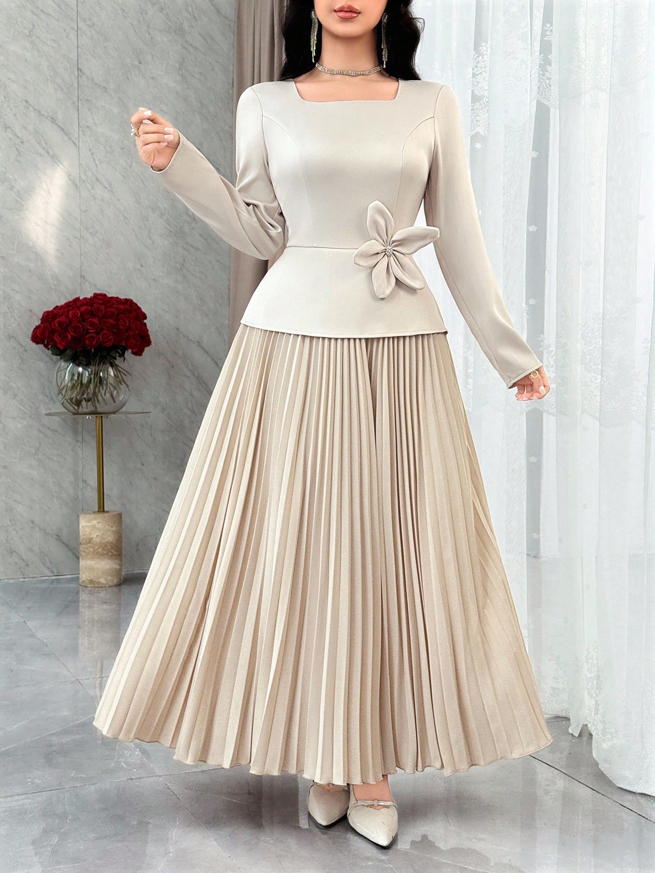 فستان أنيق بياقة مربعة وأكمام طويلة مزين بالزهور