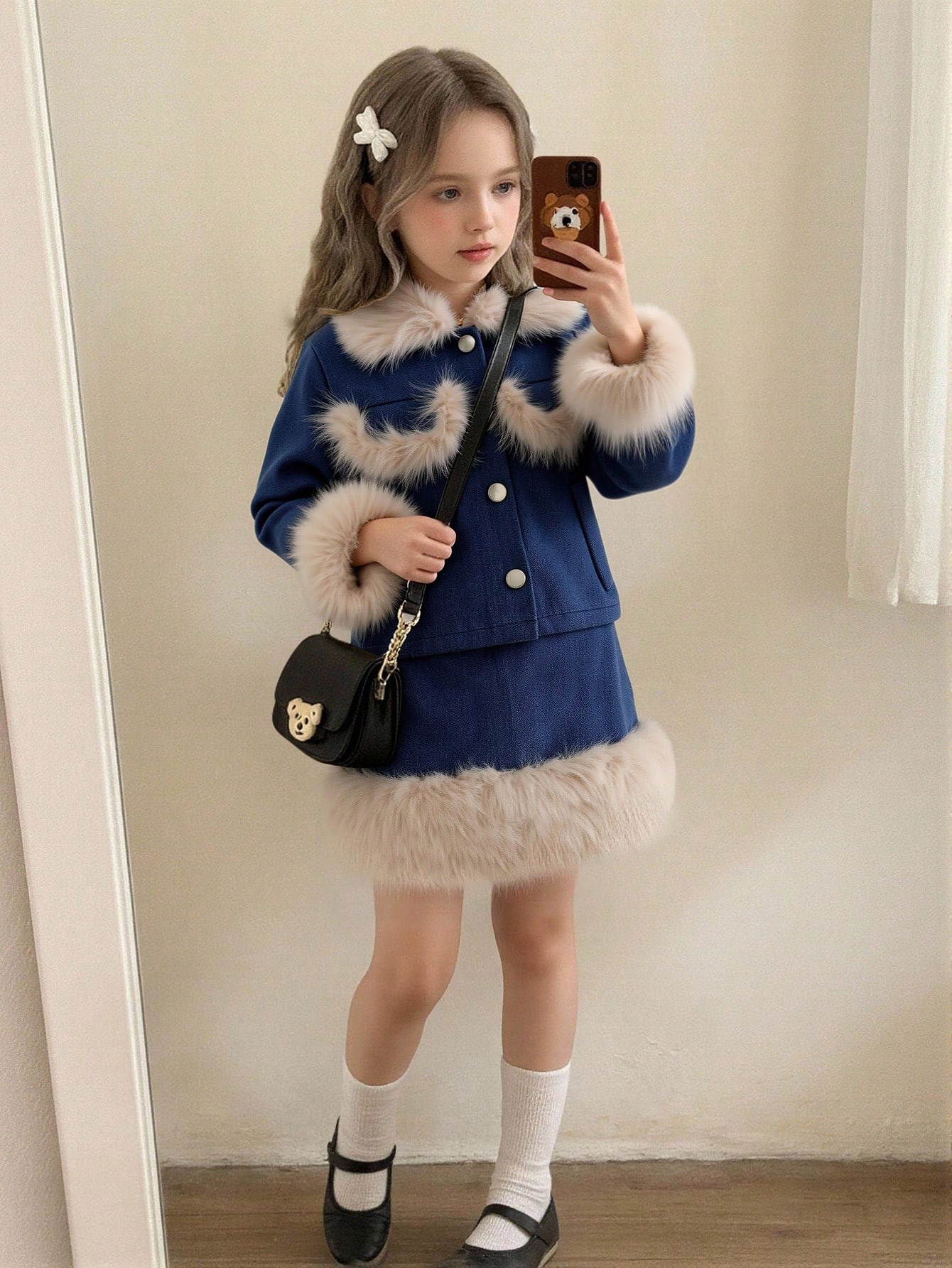 طقم بناتي شتوي أنيق: جاكيت فرو أزرق وتنورة.